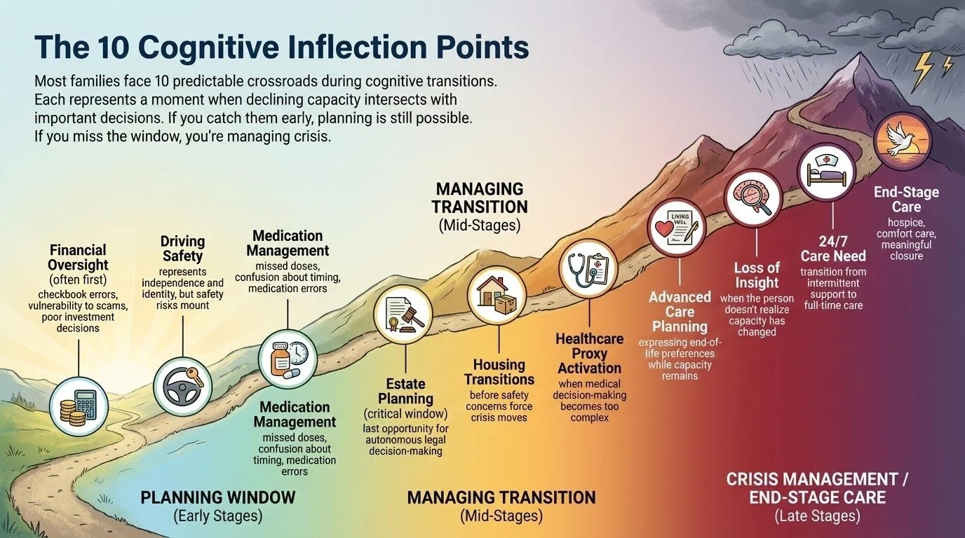 THIS IS THE MOST CRITICAL INFLECTION POINT. Once capacity is significantly impaired, legal documents may not be valid. Wishes can't be clearly expressed. Families must guess. Court involvement becomes necessary.